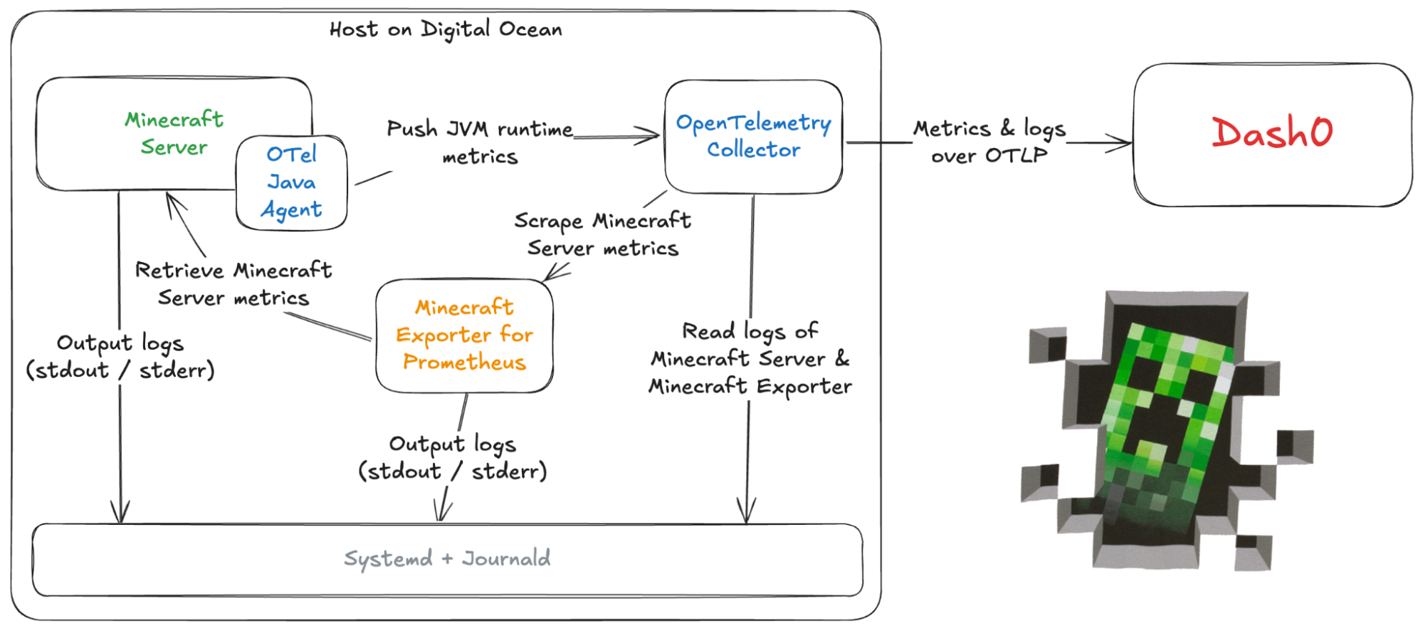 Minecraft is just a game, right? Well, that's a worldwide product which makes good money. But even if you run your own server, you want to make sure that it runs smoothly. Once it's assured you probably want to know fun stuff too: number of users, blocks mind, death statistics etc. Grab the observability solution for a minecraft server with OpenTelemetry.